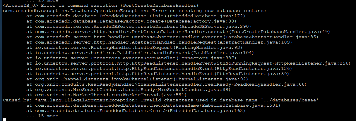 Database is not created. Studio displays error popup "Internal error Error on creating new database instance". And the terminal shows many line of errors with these key info: "Error on command execution (PostCreateDatabvaseHandler)... " and "... Invalid characters used in database name... "
