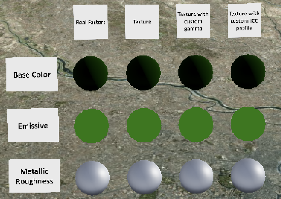 UNPACK_COLORSPACE_CONVERSION_WEBGLflag was not set toNONEas specified in the glTF documentation.When the Sandcastle from the issue is copy pasted into a local session, it should now look like this. The spheres across each row are identical.