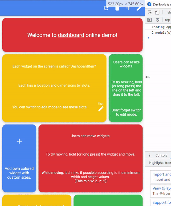 Dashboard Items can be resized both by long pressing on mobile and by holding and moving on desktop/browser.
