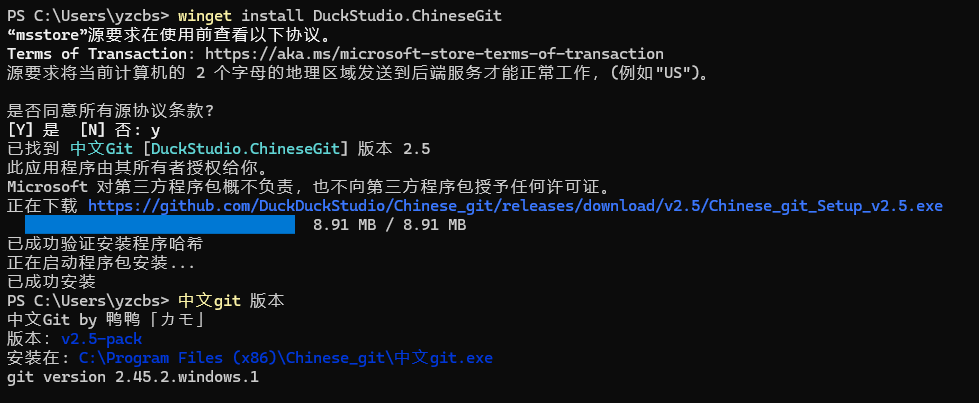 (版本不一样没关系)中文Git by 鸭鸭「カモ」 版本:v2.x 安装在: D:\...\Chinese_git\中文git.exe git version 2.47.1.windows.1