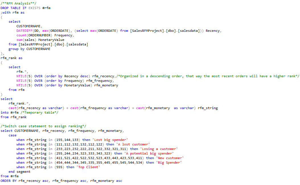Use TSQL to perform RFM segmentation analysis on sales data.
