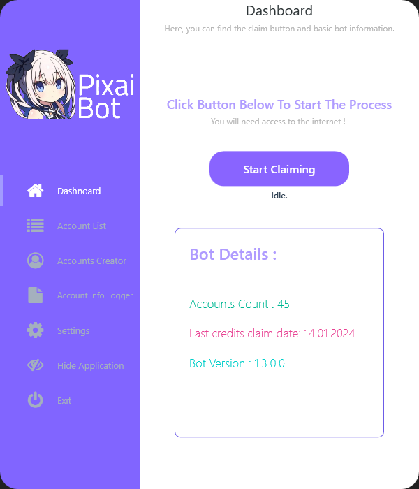 To run the bot, add an account in the settings and click the Start Claiming button.