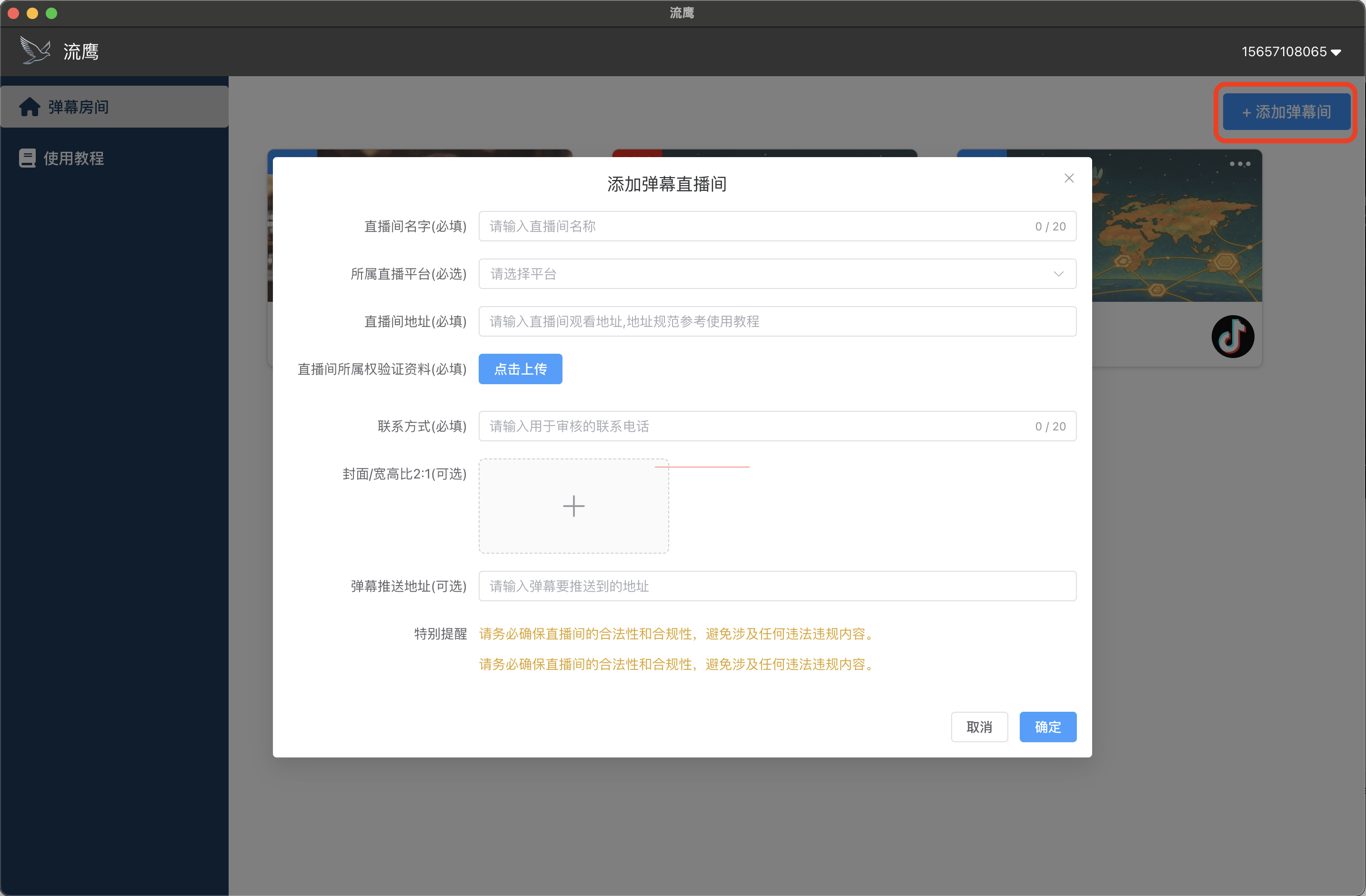 「审核时间」:由于数据源隐私和所属权验证,在创建弹幕直播间后会进入审核。通常审核时间2个工作日,节假日顺延。当然通常审核时间会很快! 「审核资料」:在创建直播弹幕间时,需要填写联系方式和审核资料,请务必认证填写,如果有疑问,我们会发起电话咨询,以确保资料有效性!