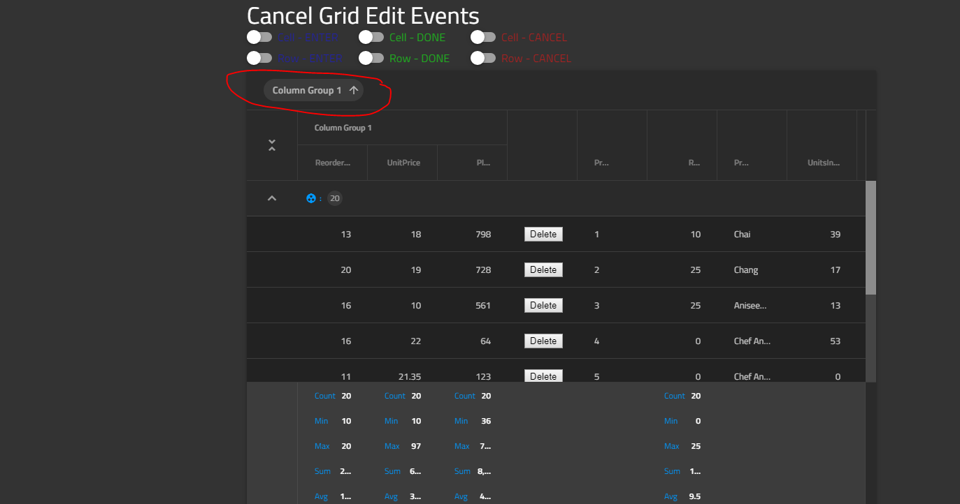 In the grouping area the name of the group column is 'Column Group 1' and it cannot be sorted or removed