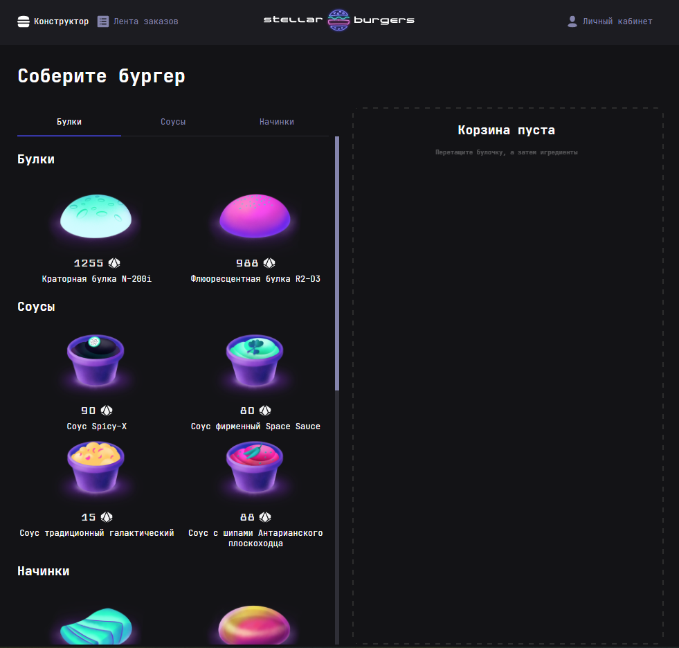 Это приложении для заказа бургеров работающее на React и Redux, которое обладает функцией сборки бурегра самостоятельно по ингредиентам. Заказ можно совершить будучи авторизваным пользователем. Есть возможность просмотра заказов которые находятся в работе, или уже собраны, так же данный функционал реализован в личном кабинете