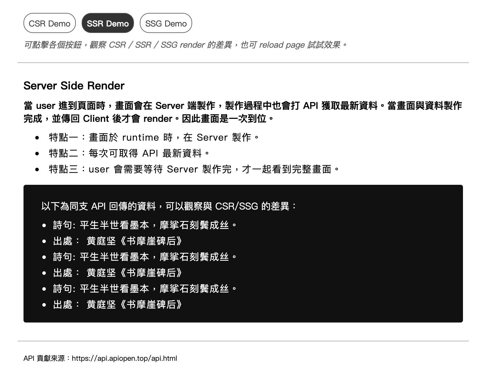 p.s. 如果採用 npm run dev 是無法觀察出 SSR / SSG 的差異,需要使用 npm run start 才能觀察出差異。npm run start 前,記得要先 npm run build。