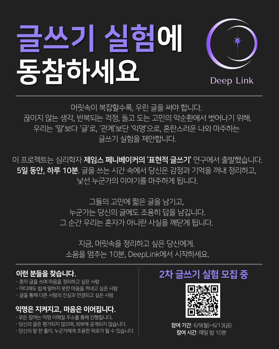 μ°λ¦¬λ λ§λ³΄λ€λ κΈλ‘, κ΄κ³λ³΄λ€λ μ΅λͺ μΌλ‘, λ΄λ©΄μ μ리μ κ·λ₯Ό κΈ°μΈμ΄λ 5μΌ κ°μ κΈμ°κΈ° μ€νμ μ μν©λλ€.