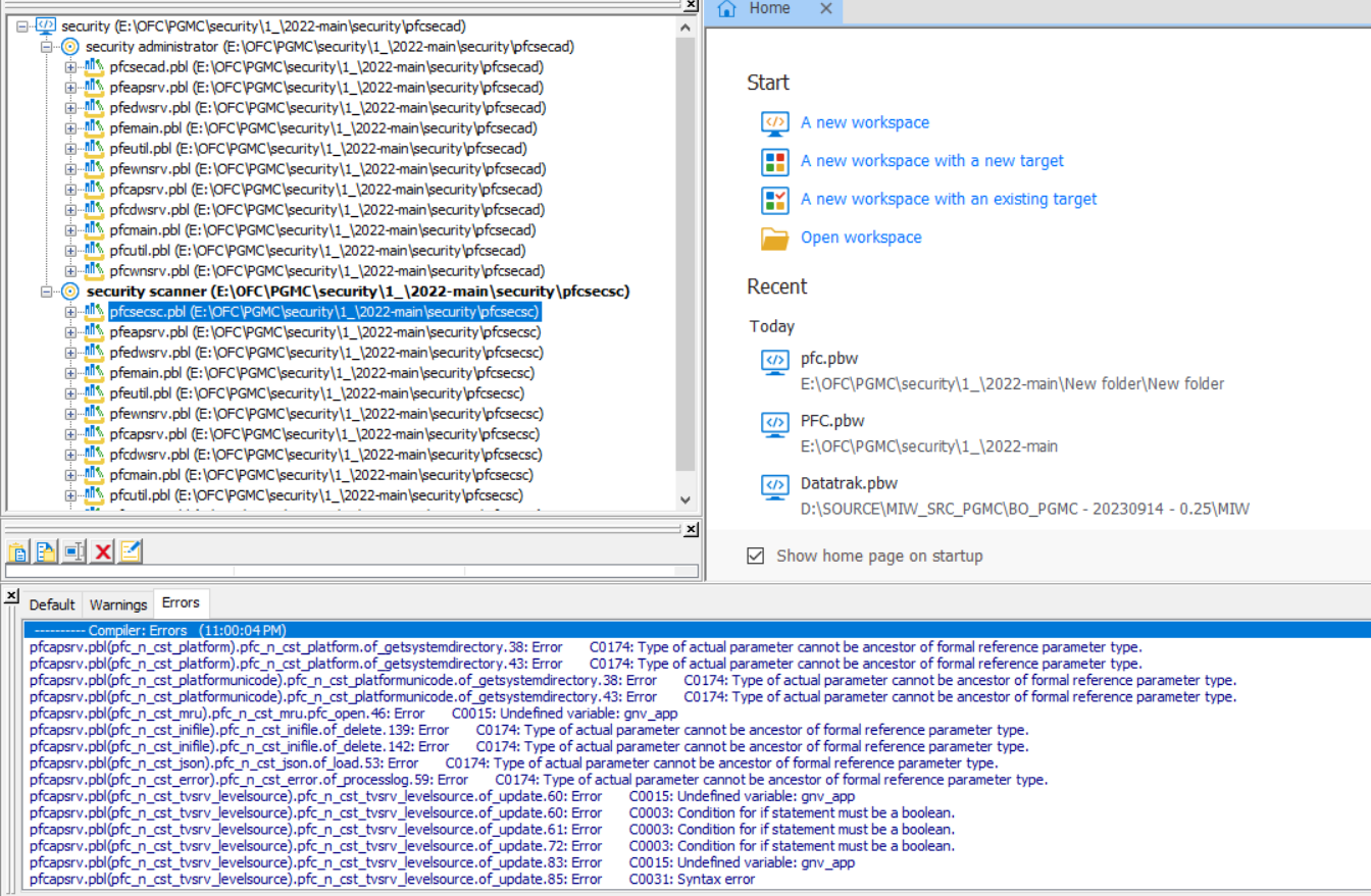 Well, due to getting ready for Elevate and following up on items coming out of it that took a lot longer than I expected. Apologize for that. I think the primary issue is that you've added the PFC libraries to the library search path. The security scanner is not a PFC based application. In a PFC based application there would be a global variable of type n_cst_appmanager or a descendant of that. Also, the SQLCA, error and message variable types for the application object would likely be based off of n_trans, n_err and n_msg The errors you're seeing is from the PFC layer not finding that global variable app manager, which isn't needed for the utility. Try removing the PFC libraries from that target and recompiling it. It works fine for me. |