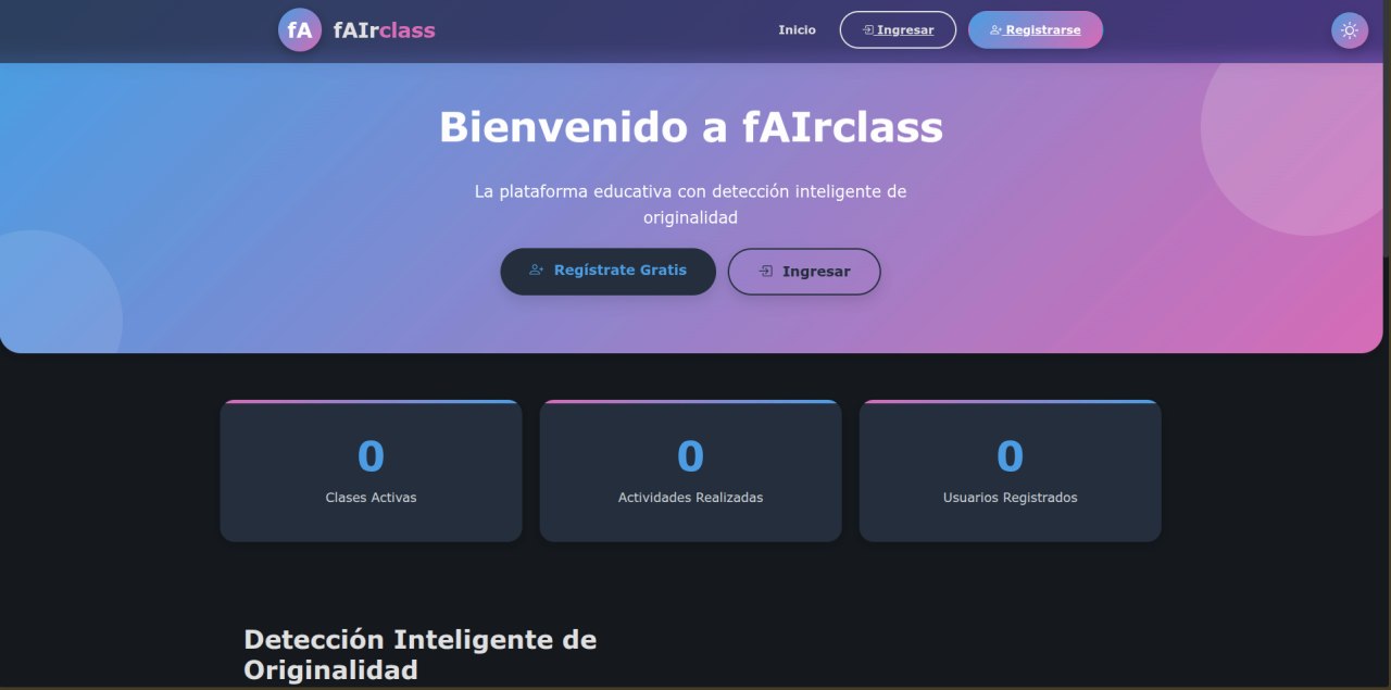 fAIrclass es un proyecto escolar diseñado para crear un sistema de gestión de aulas virtuales sencillo pero potente. Su objetivo principal es facilitar la interacción entre profesores y estudiantes, la gestión de actividades y, crucialmente, la detección de similitudes en los trabajos entregados.
