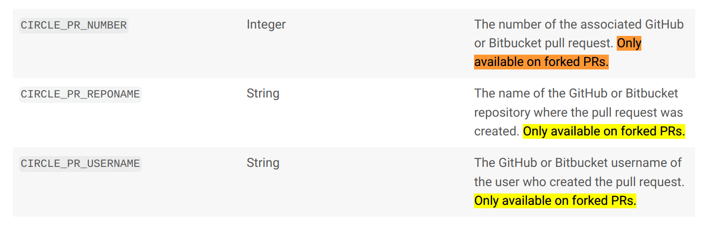 CIRCLE_PR_NUMBER?CIRCLE_PR_NUMBERis recommended by the Circle Blog: https://circleci.com/blog/managing-secrets-when-you-have-pull-requests-from-outside-contributors/CIRCLE_PR_NUMBERis only defined on PRs from external forks and shouldn't have any effect on PRs from internal branches.CIRCLE_PR_NUMBERis just one of 3 Circle CI environment variables that exist only on PRs from external forks. The other two areCIRCLE_PR_REPONAMEandCIRCLE_PR_USERNAME.Source: https://circleci.com/docs/variables/#built-in-environment-variables
