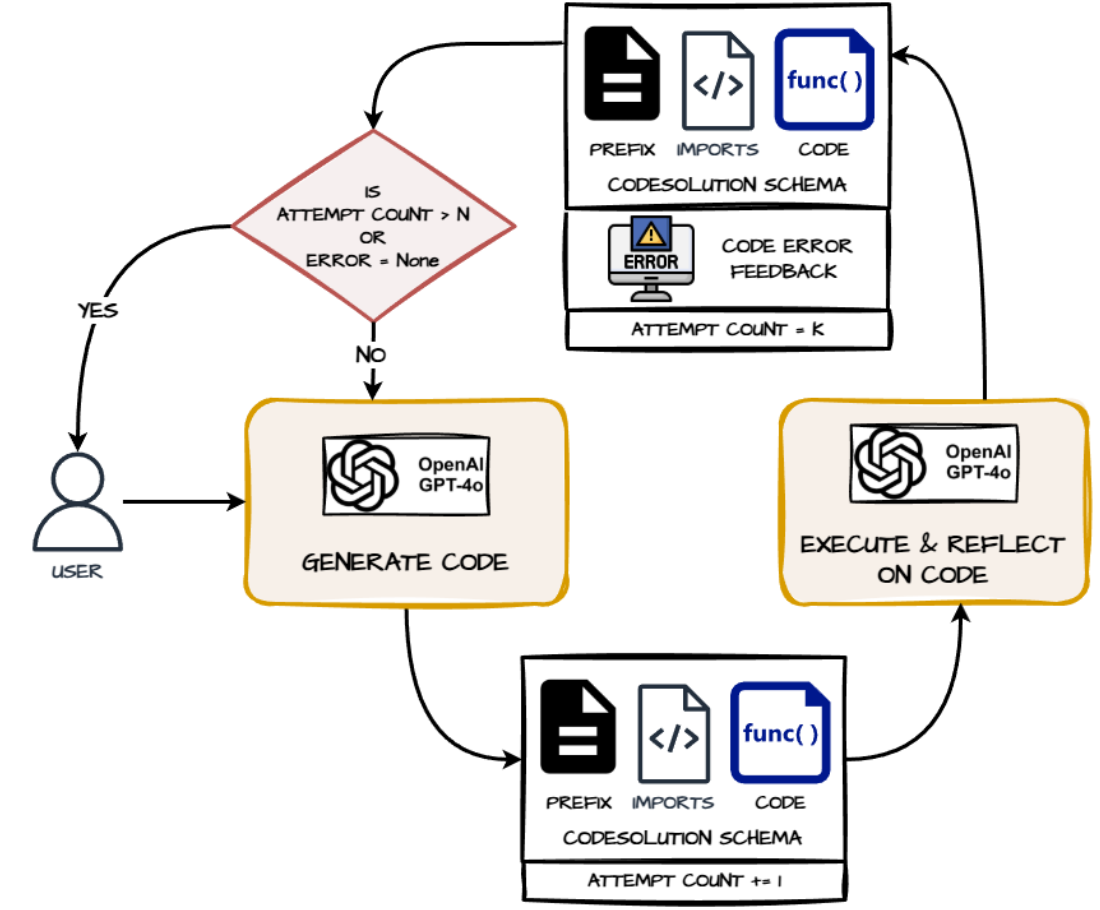 - Once the code passes execution without errors, the refined solution is presented to the user as the final output.