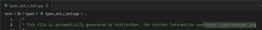 Generate some unit tests with UTbotCPP and open generated file. Note that header contains wrong link to site - https://unittestbot.org while should it https://www.utbot.org/