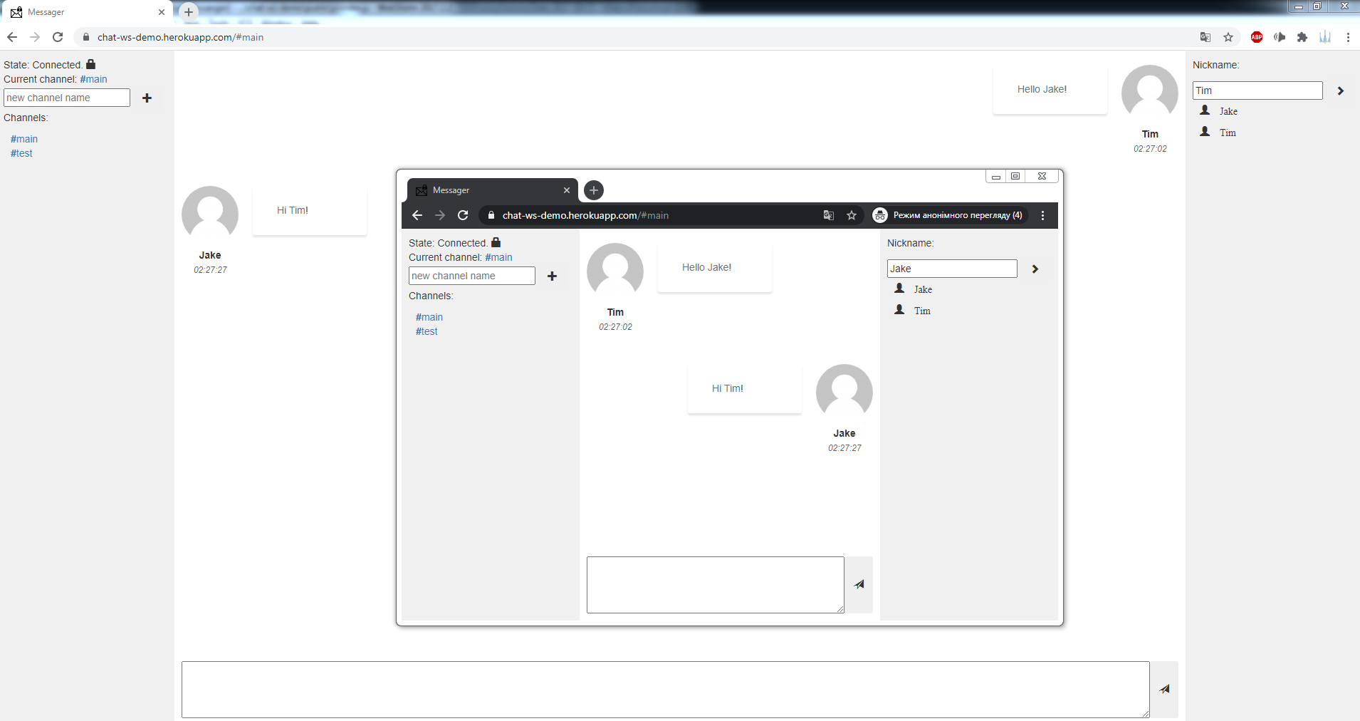 Live demo: https://chat-ws-demo.onrender.com/ { type: 'demo project', date: '21.12.2018', refactoring: 'trial', }