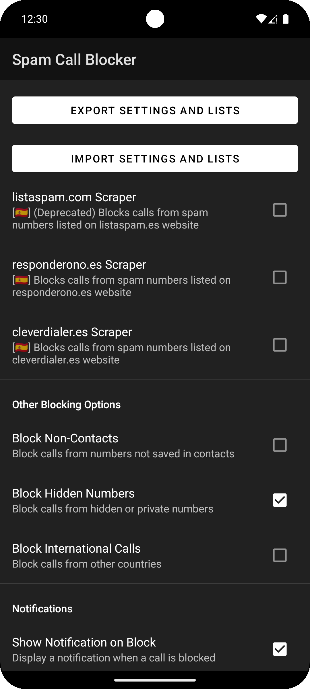 - Export: Users can export all their preferences, including settings and black/white lists of numbers, to a file for backup or transfer to another device.