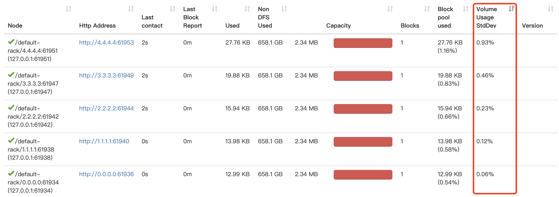 To prevent the namenode from being too busy, we can calculate the standard variance on the datanode side, transmit it to the namenode through heartbeat, and display the result on the Web of namenode. We can then sort directly to find the nodes on the Web where the volumes usages are unbalanced.