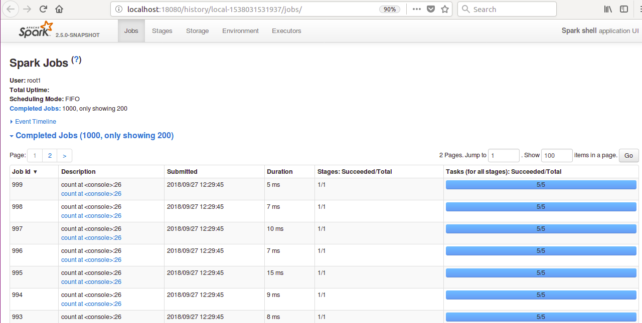 So we need to override the spark properties from the History spark-default.conf properties, which will match the number of jobs showing in jobs page and value of "spark.ui.retainedJobs" in the Environment Page.