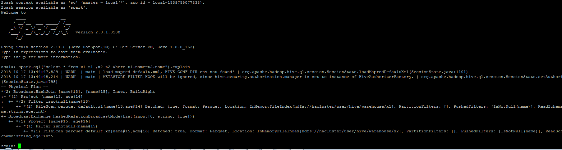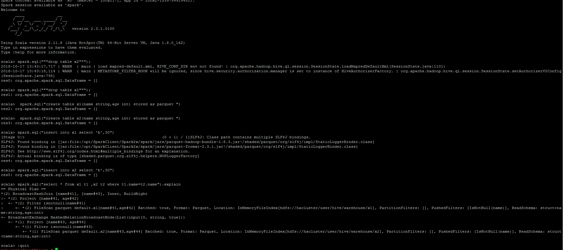 Login to spark-shell => create 2 tables => Run insert commad => Explain the check the plan =>Plan contains Broadcast join => Exit