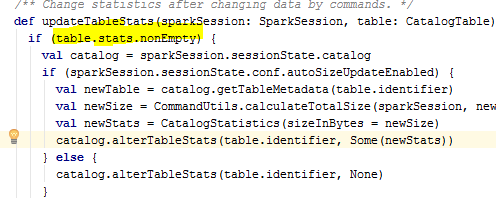 def updateTableStats(sparkSession: SparkSession, table: CatalogTable): Unit = {