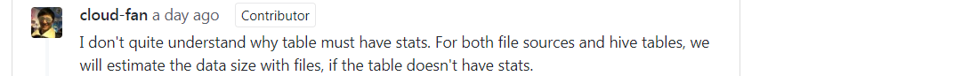 I don't quite understand why table must have stats. For both file sources and hive tables, we will estimate the data size with files, if the table doesn't have stats.