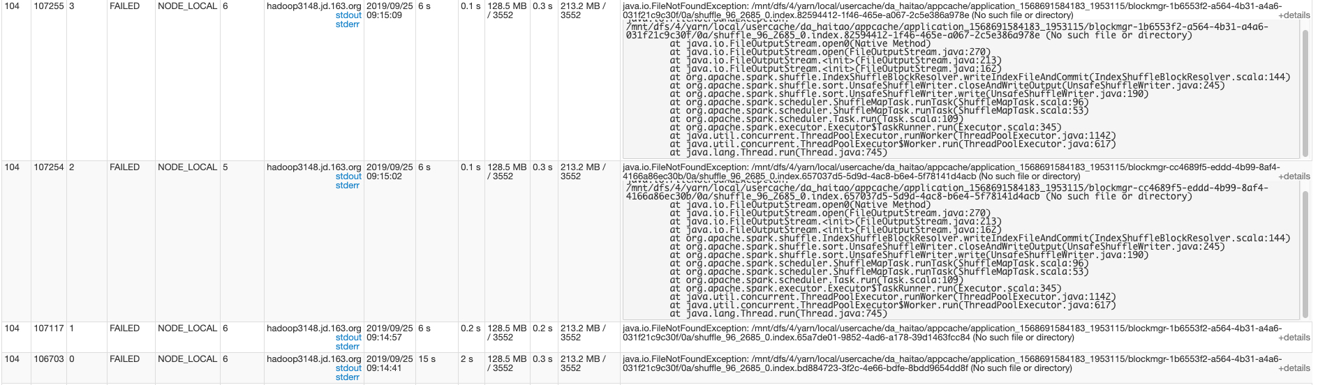 The following picture shows one failure job caused by 4 task attempts were all delivered to the same node and failed with almost the same exception for writing the index temporary file to the same bad disk.