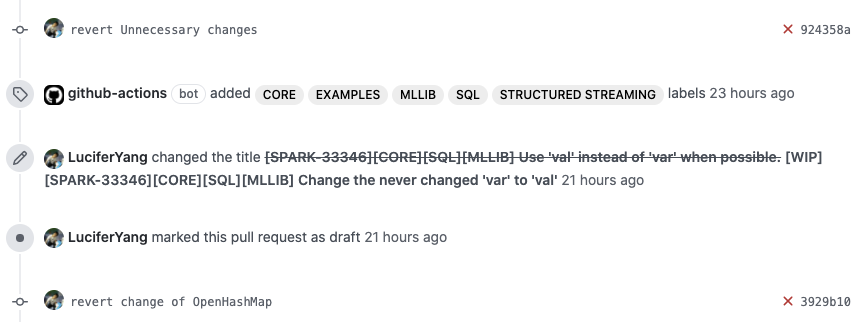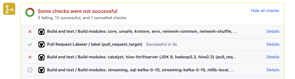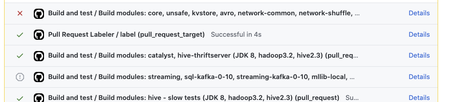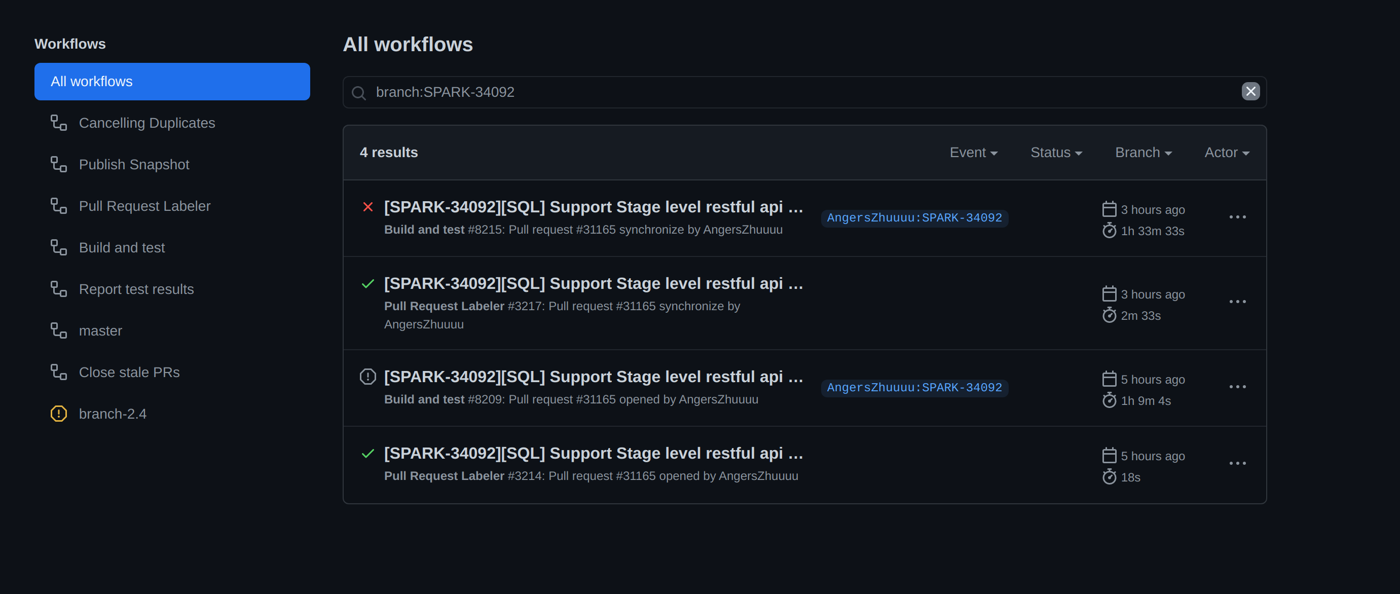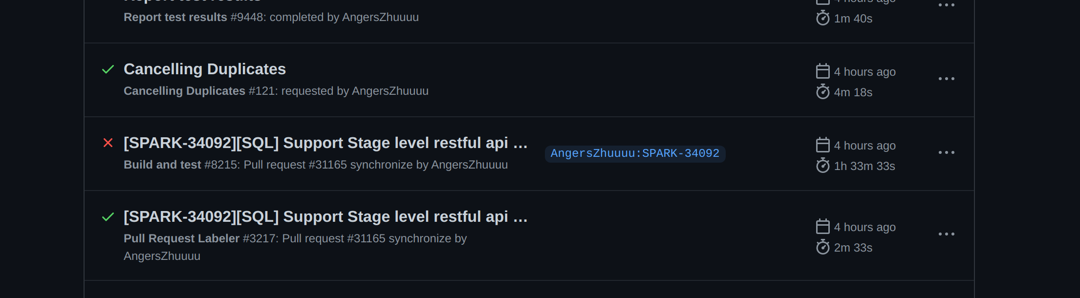 I think it works as expected. Unfortunately GA have very poor filtering in the "actions" list but there is one trick - you can filter by "branch" and for PRs it works pretty well: You will see here an example : SPARK-34092 branch was pushed twice and one of the two workflows managed to complete from the first push before it was re-pushed. The other workflow was still running when re-push happened and it was cancelled (as expected). The second push failed however (but it was failing test not cancelling). |