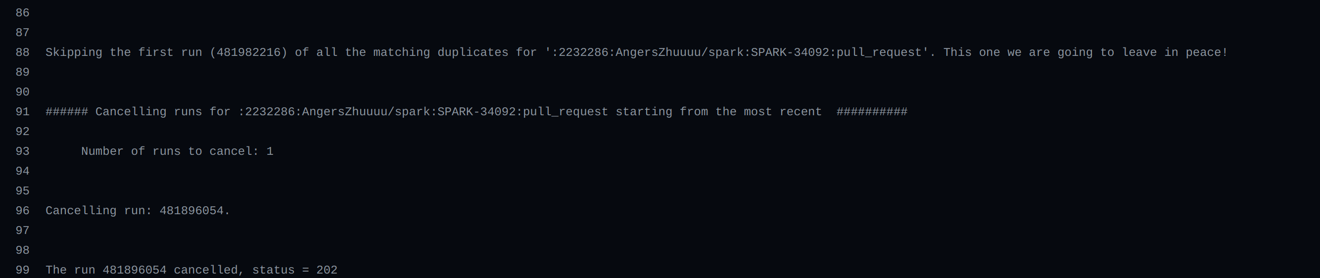 Also it's not easy to mtch the "canceling" workflow (unfortunately :( ) but you can scroll through the list of workflow and the cancelling workflow will be usually adjacent to the triggering workflow: If you look at the logs of this worfkflow you will see what happened (hoever due the way cancel action works it might be another cancel job that was run slightly earlier from the queue). In this particular case it is the previous 'cancel duplicates" job that triggered the cancel: https://github.com/apache/spark/runs/1692933716?check_suite_focus=true And you can see the logs telling exactly what happened: Hope it helps :) |