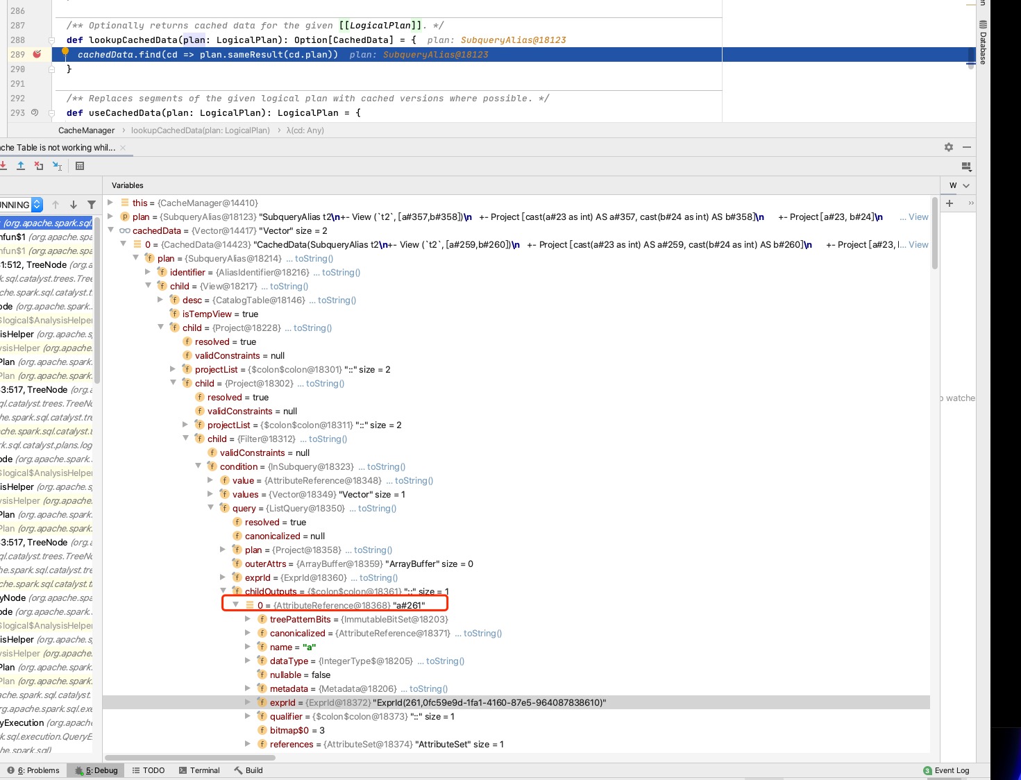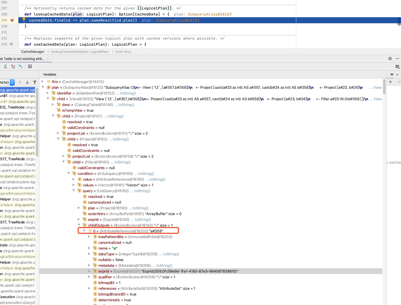 canonicalizedof two plans is equals.canonicalizedofplanof twoListQueryis equals, butcanonicalizedof childOutputs is different because their exprIds are different.In the end, the cache did not take effect.