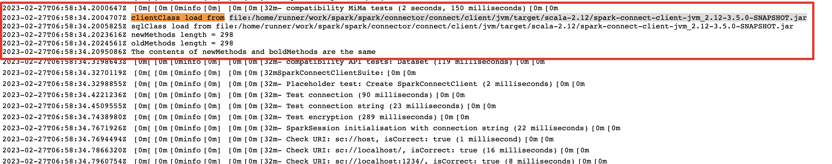 From the log, I found that both clientClass and sqlClass are loaded from file:/home/runner/work/spark/spark/connector/connect/client/jvm/target/scala-2.12/spark-connect-client-jvm_2.12-3.5.0-SNAPSHOT.jar, and the contents of newMethods and oldMethods are the same ...