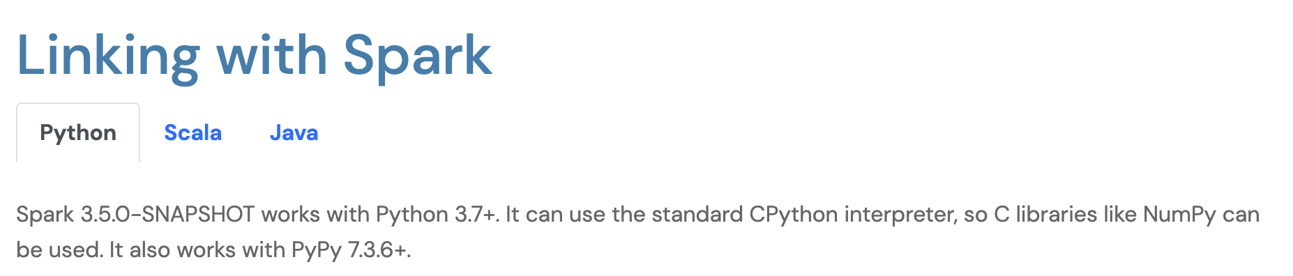 …r all code snippets (Spark 3.4 and below) ### What changes were proposed in this pull request? This PR proposes to recover the availity of switching languages consistently across docs for all code snippets in Spark 3.4 and below by using the proper class selector in the JQuery. Previously the selector was a string `.nav-link tab_python` which did not comply multiple class selection: https://www.w3.org/TR/CSS21/selector.html#class-html. I assume it worked as a legacy behaviour somewhere. Now it uses the standard way `.nav-link.tab_python`. Note that #42657 works because there's only single class assigned (after we refactored the site at #40269) ### Why are the changes needed? This is a regression in our documentation site. ### Does this PR introduce _any_ user-facing change? Yes, once you click the language tab, it will apply to the examples in the whole page. ### How was this patch tested? Manually tested after building the site.  ### Was this patch authored or co-authored using generative AI tooling? No. Closes #42989 from HyukjinKwon/SPARK-45210. Authored-by: Hyukjin Kwon <gurwls223@apache.org> Signed-off-by: Hyukjin Kwon <gurwls223@apache.org>