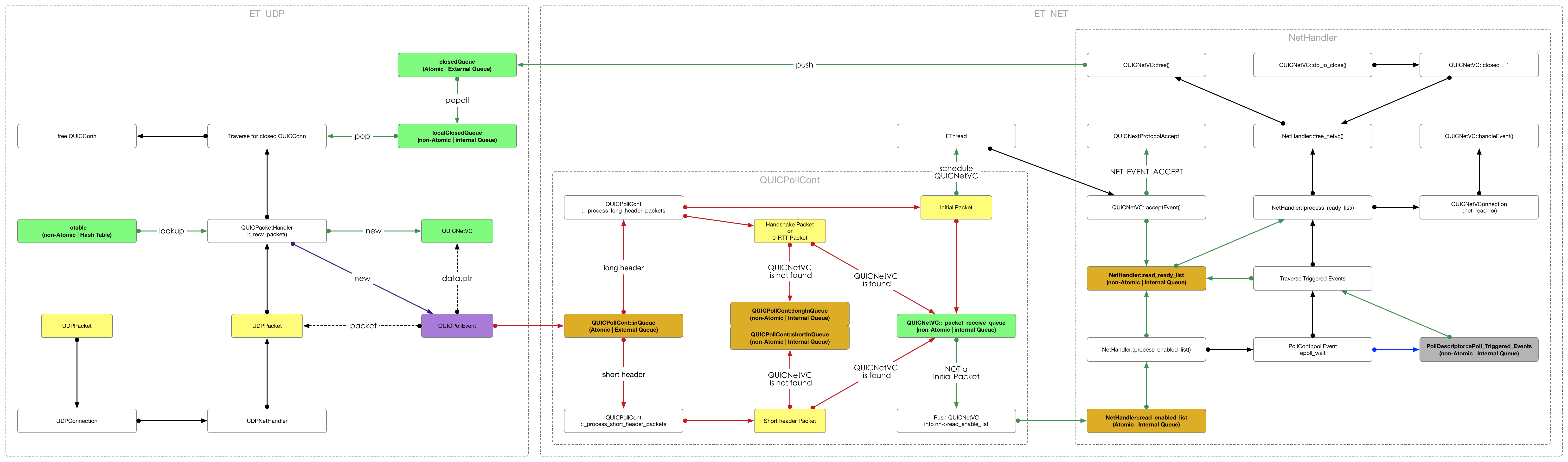 We create QUICPollCont to dispatch UDPacket to different qvc. And NetHandler will callback to qvc handler to process packet.