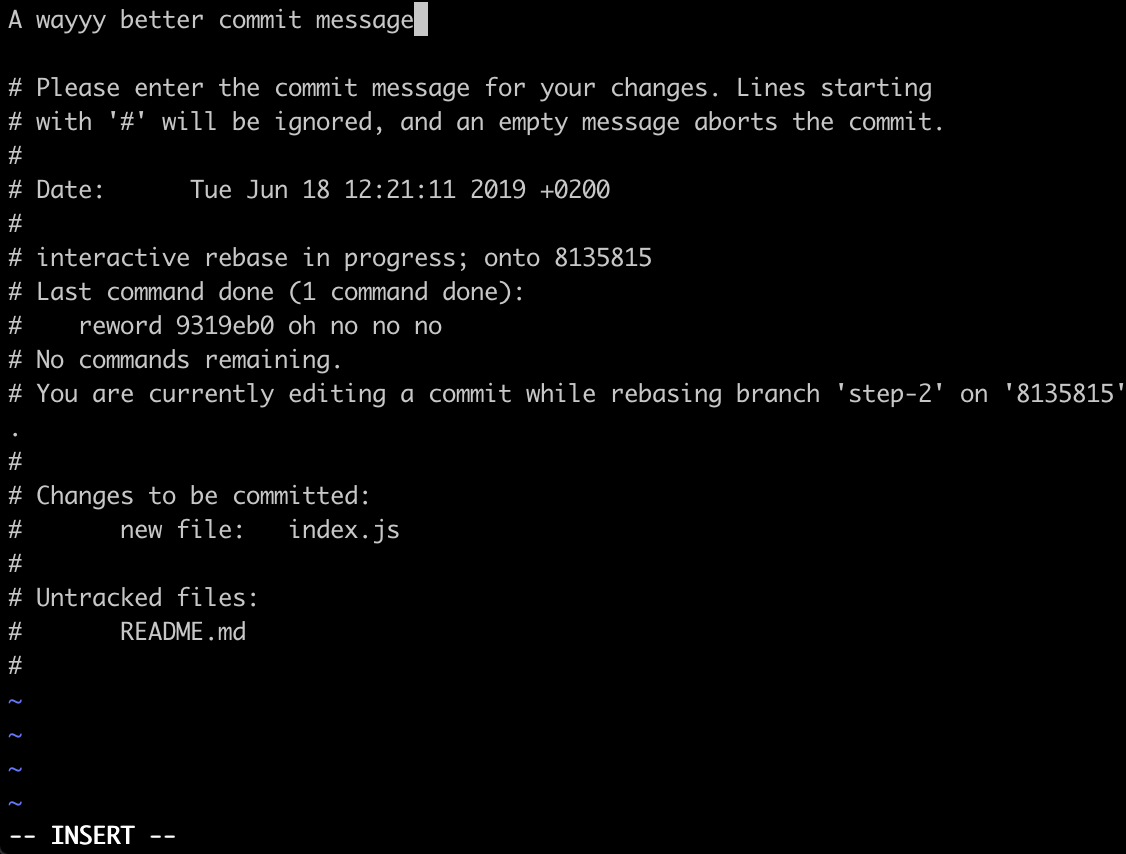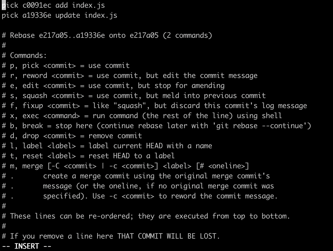 f a19336e update index.jsNow, we want to apply the rebase, press escape to leave the INSERT mode, press : (colon) and enter wq for "write" and "quit" and press ENTER to apply these changes. The colon simply allows you to write commands for Vim to execute.