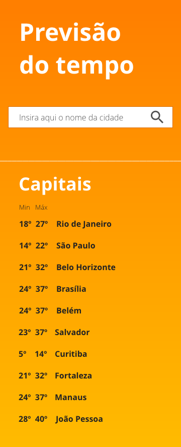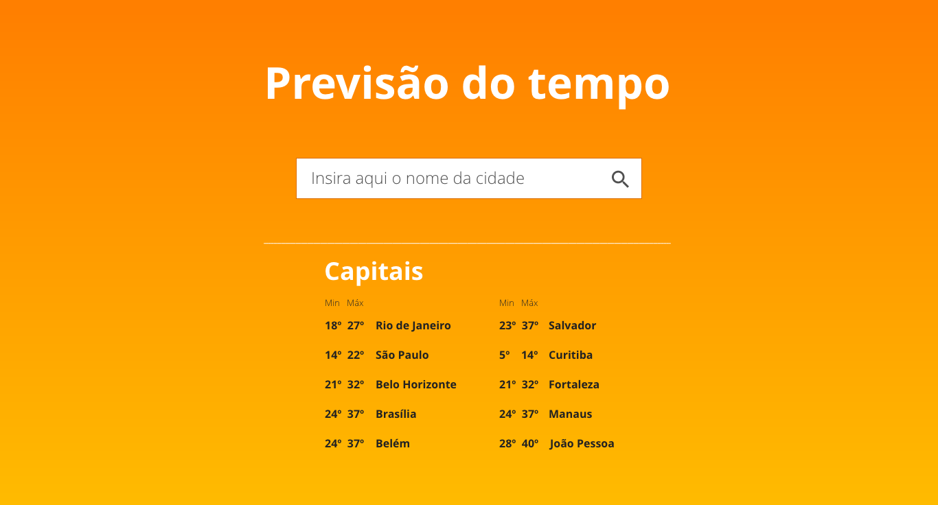 Vamos dar uma olhada na previsão do tempo? A meta é criarmos uma página simples, que consuma a API do Yahoo de previsão do tempo (https://developer.yahoo.com/weather/). O layout final deverá ficar o mais próximo possível da versão abaixo (sim, vamos ter a versão responsiva mobile e a versão desktop):