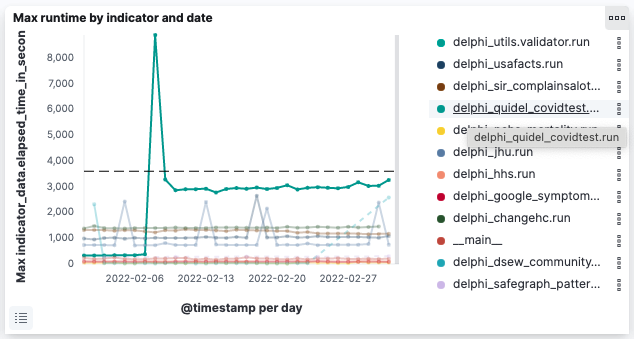 The omicron signals appear to have substantially increased the running time for the Quidel indicator. Here's a plot of the running time for the Quidel indicator over the last 30 days, relative to the other indicators. The dotted threshold line is at 1 hour.