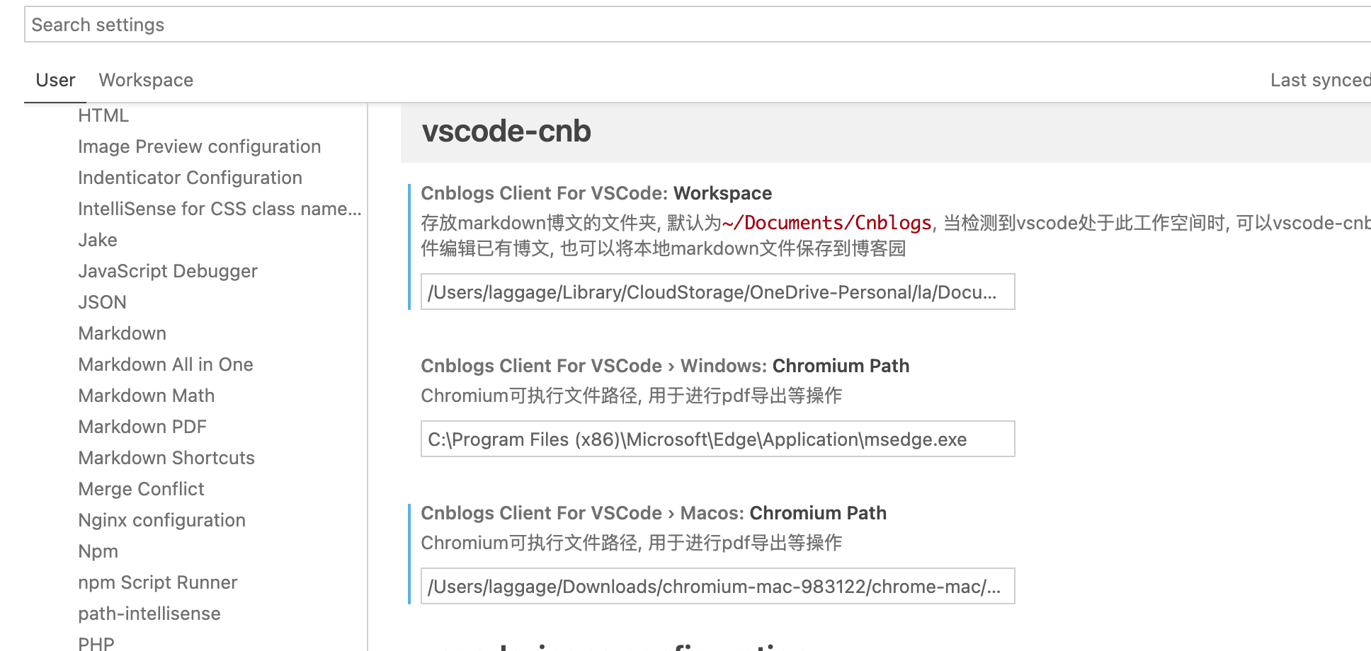 workspace:扩展需要用到的工作空间,扩展仅当检测到 VSCode 处于此目录下才会生效,默认值为~/Documents/Cnblogs。