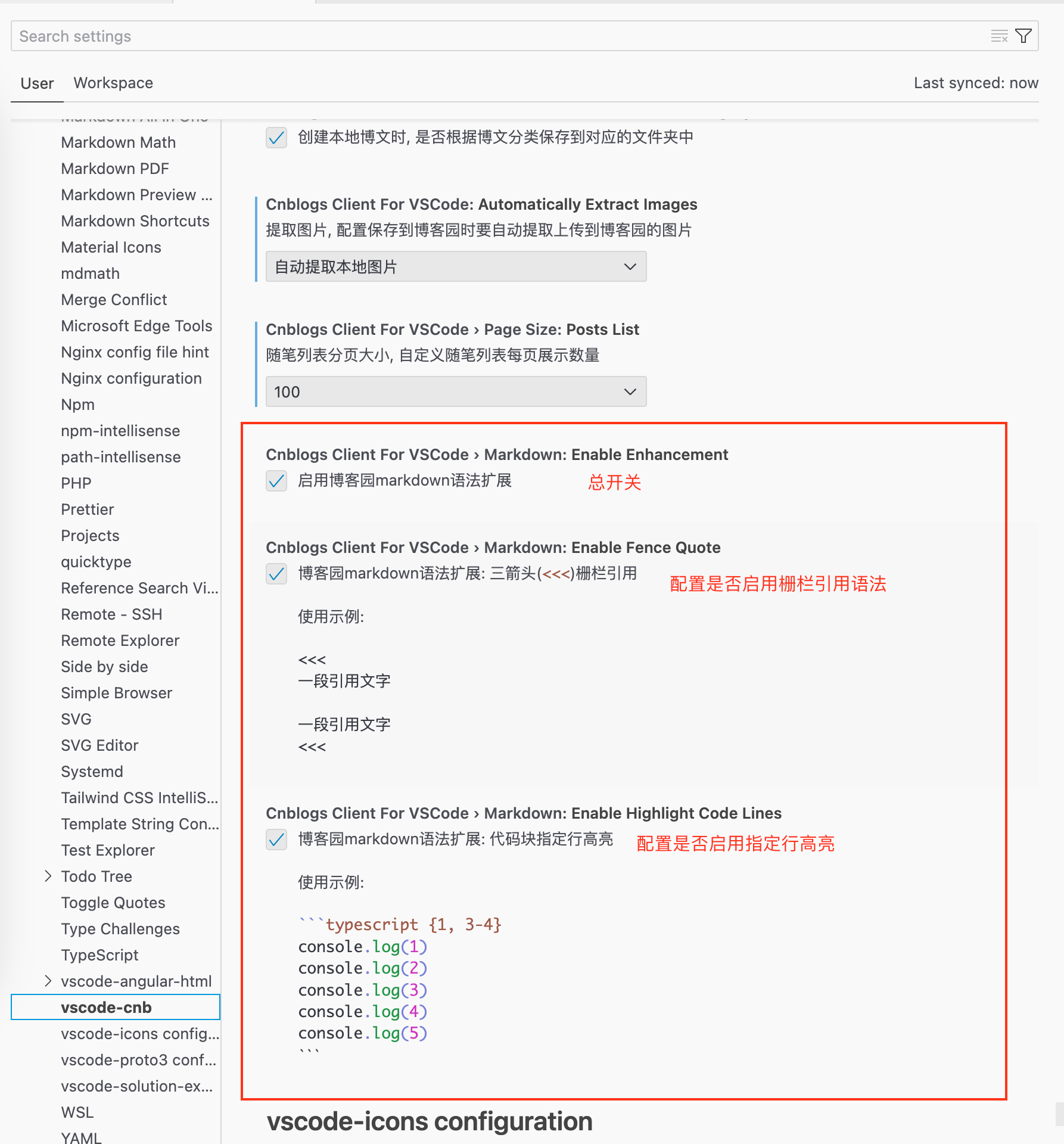 本扩展可以让 VSCode 中的 markdown 预览支持博客园中扩展的 markdown 语法,您可以通过设置来控制是否要启用此功能。