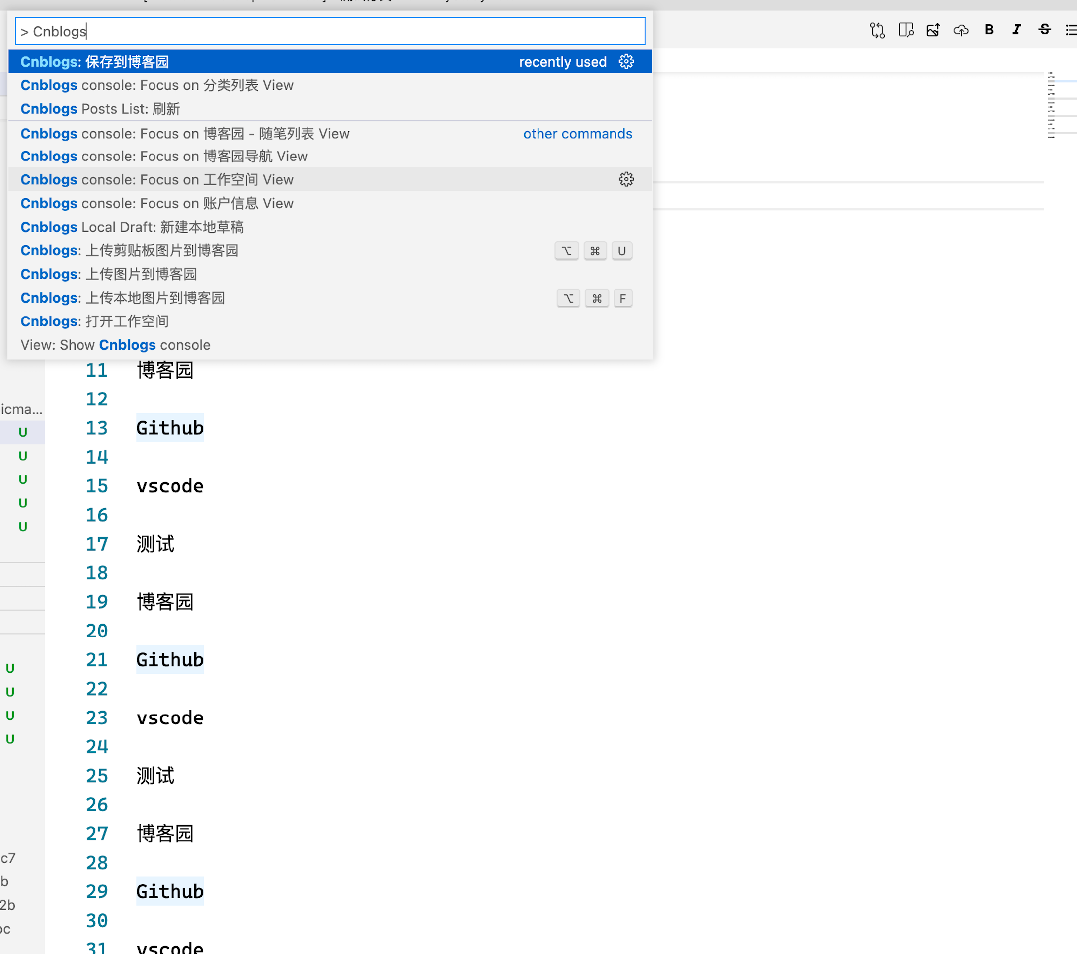 也通过 VSCode 的 Command Palette(唤起 Command Palette 快捷键,windows:ctrl+shift+p,macOS:cmd+shift+p)调用 Cnblogs: 上传到博客园命令,将当前正在编辑的 markdown 上传到博客园。
