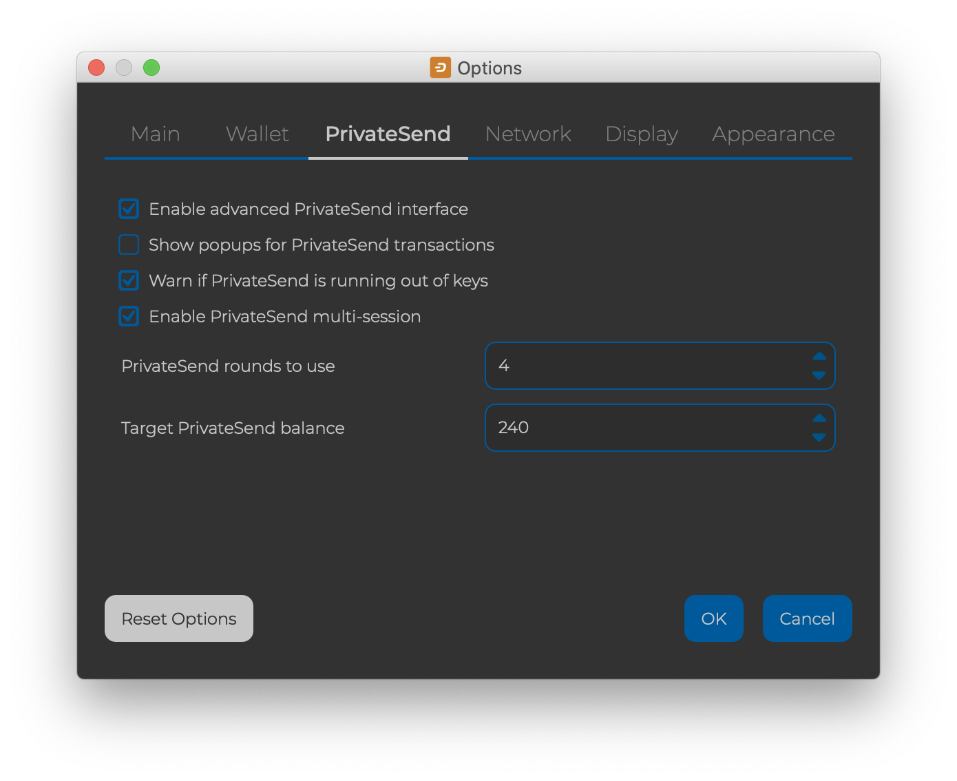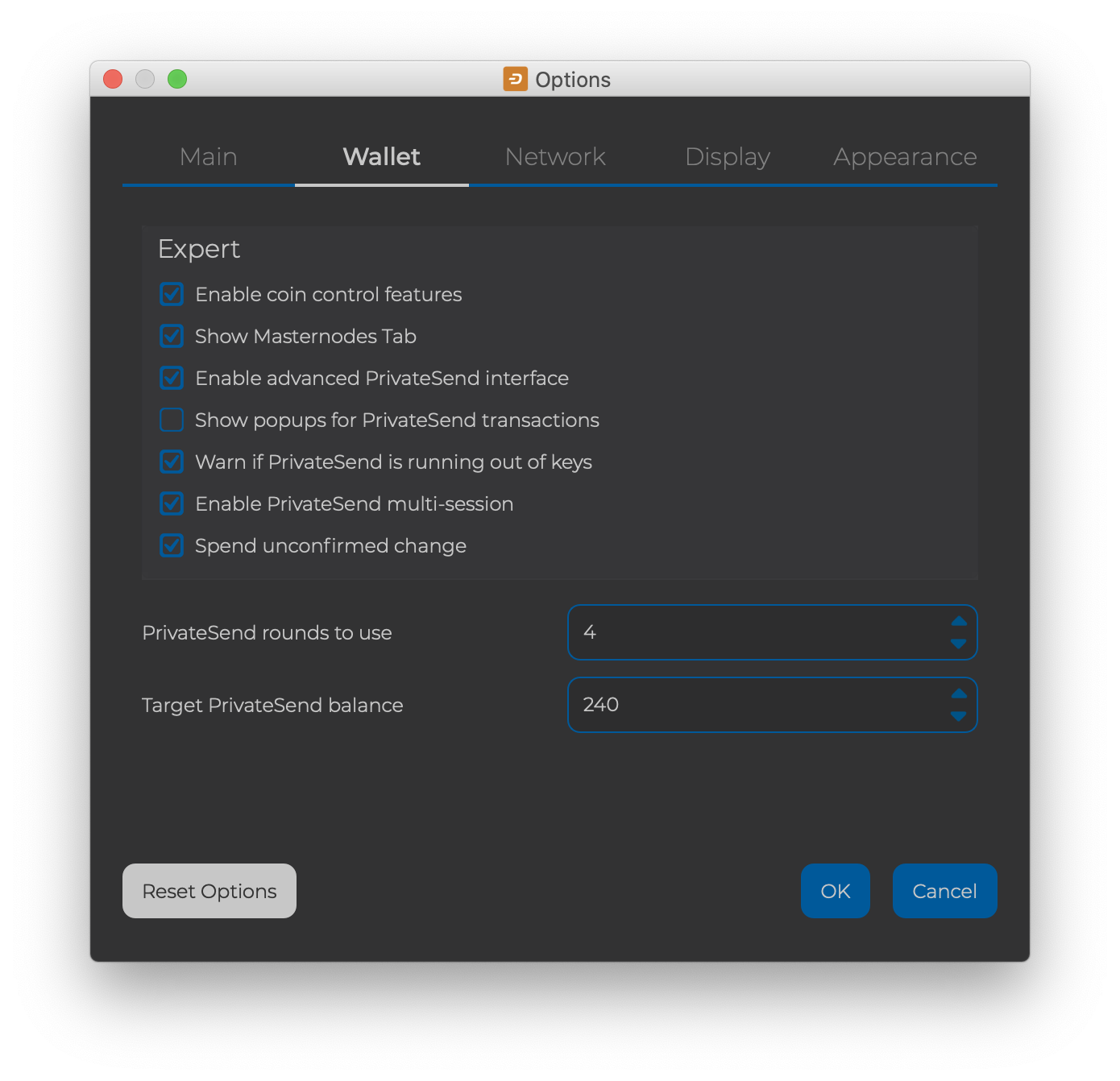 Options -> Walletinto a new tabOptions -> PrivateSendEnable PrivateSend interfaceinOptions ->Wallet. This checkbox allows to dynamically show/hide the PrivateSend related UI elements all over the placeBased on #3716 and #3715
