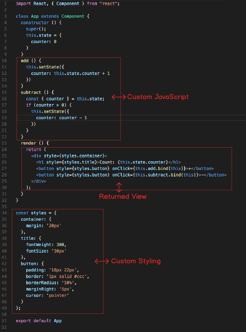 A React app is made up of a series of components which can contain their own dynamic state. Here is an example of a simple counter component which maintains it's own state: React Component Screenshot