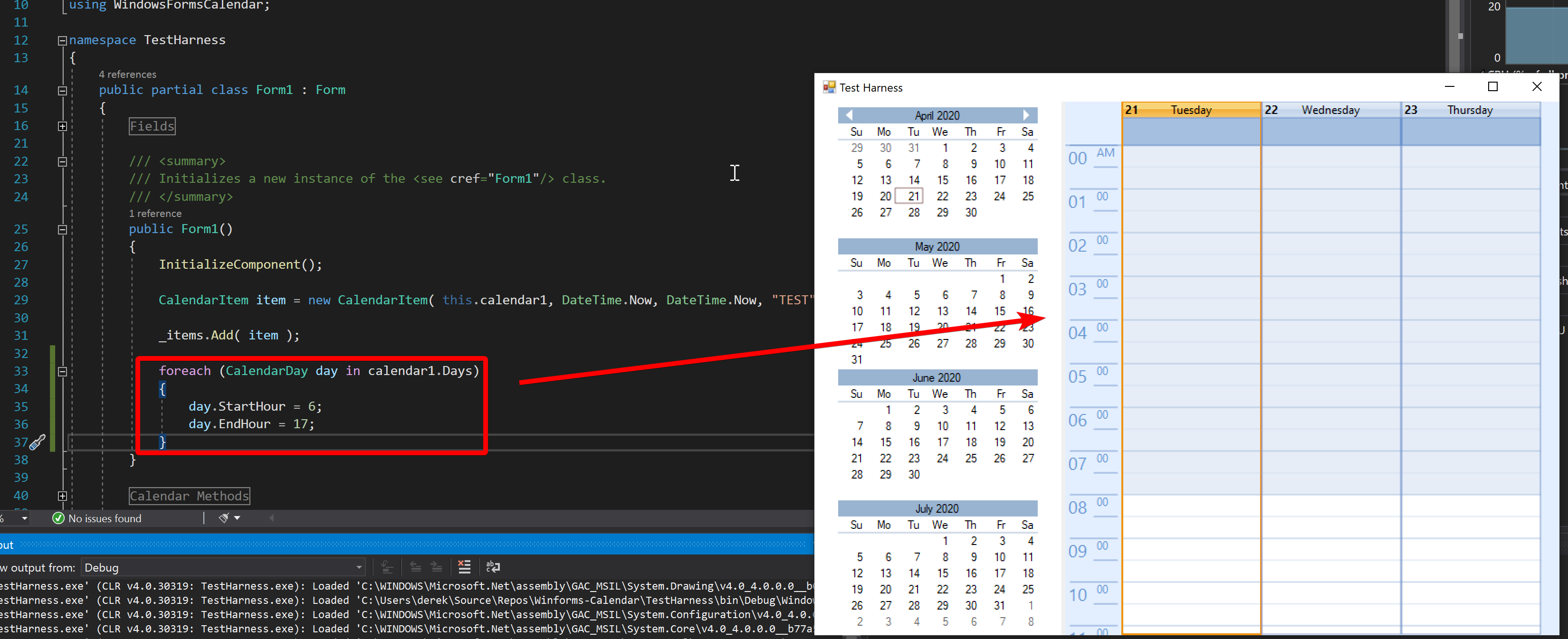Use Calendar.SetRenderHourRange(int StartHour, int EndHour) to render a range of time for each day.