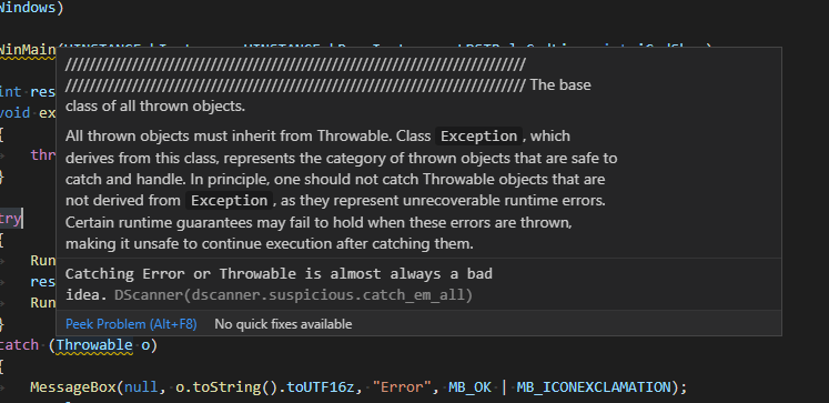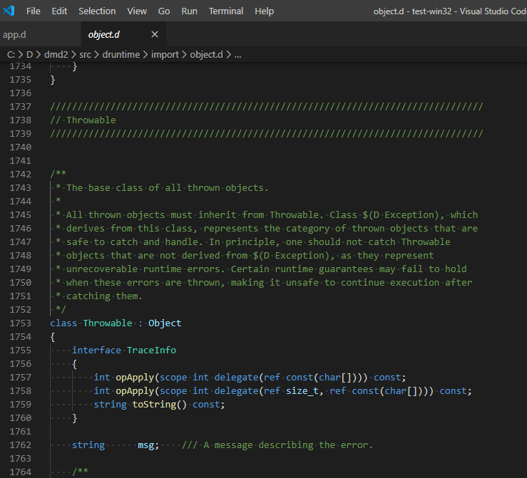 If you look at http://dpldocs.info/experimental-docs/object.Throwable.html and https://dlang.org/phobos/object.html#.Throwable you will see that these block of comments are not included.