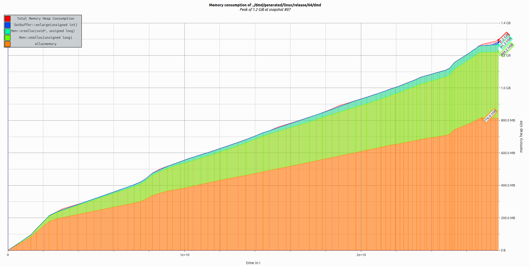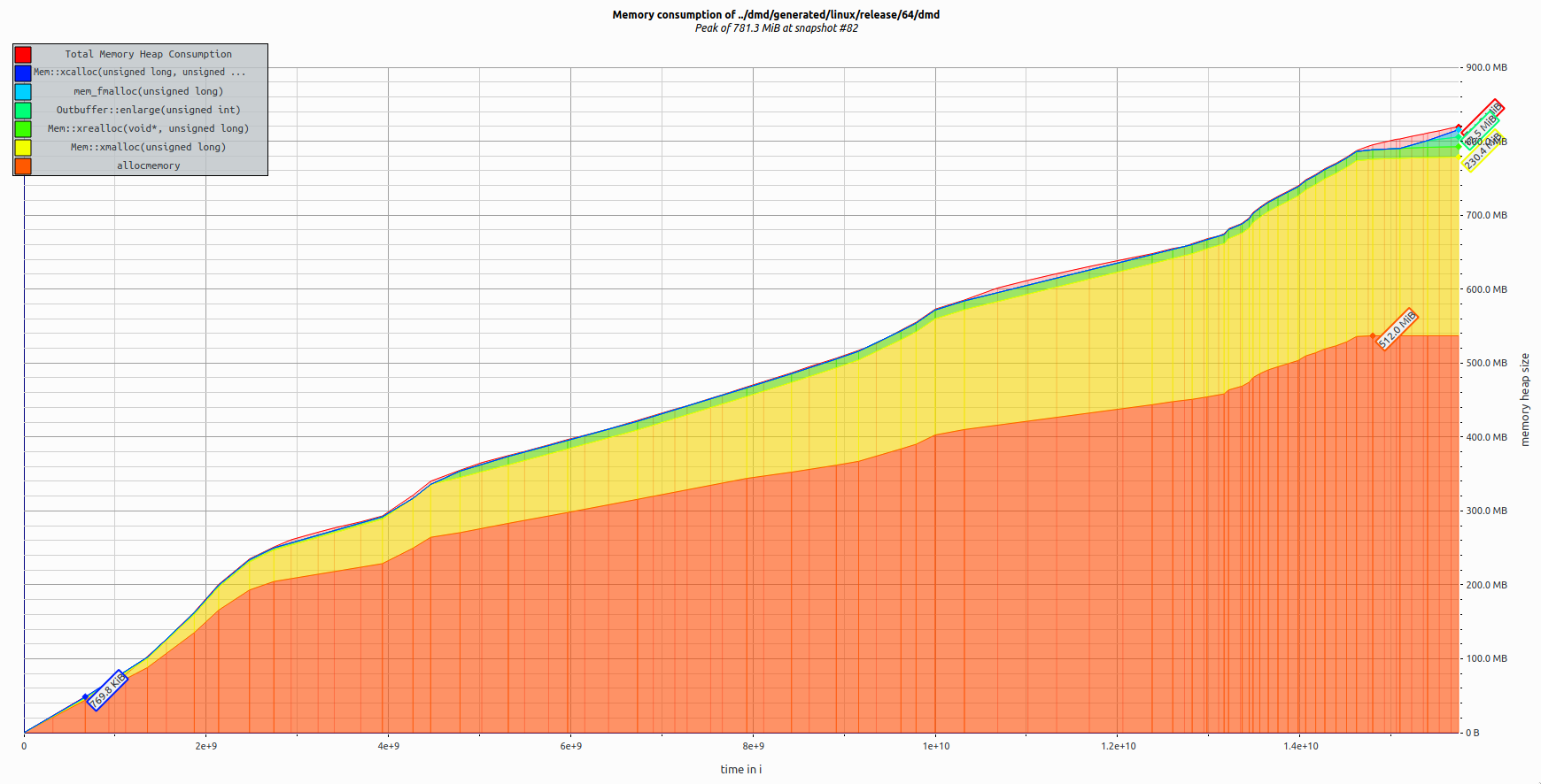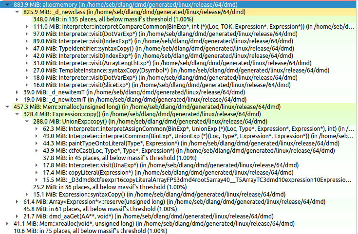 @UplinkCoder I'm very interested in a tool that will explain why/where dmd is allocating memory, so that I know where to look. Right now it's just an unhelpful I did try to (very crudely) add memory usage output lines to |
