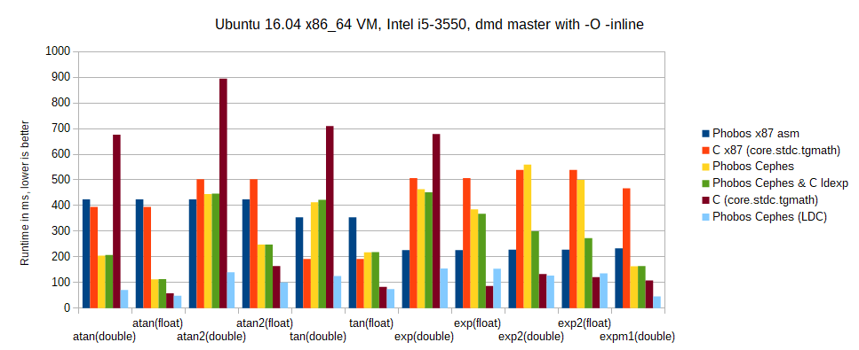 I ported this to LDC (with LLVM 6.0.0 and using C ldexp), and the results are way better than expected: overall speed-up factor of >3 for the new double/float versions compared to the old ones, only beaten by the C runtime in 2 cases ( |
