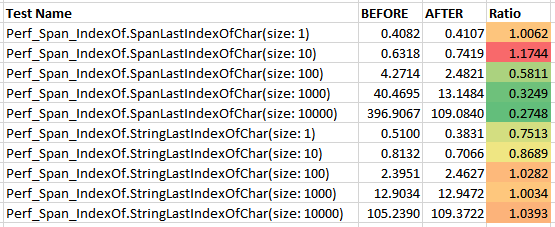 The extra span.Length checks (required by the way string.LastIndexOf was implemented) ends up adding overhead for small spans.TODO: Investigate a way to avoid that overhead without having two separate implementations.Related PR: #17284