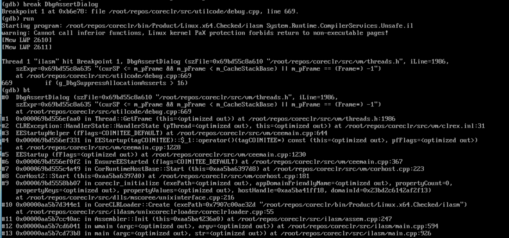 I built my own CHK ILASM (not sure if it's exactly what we get with official builds since I could not easily find what packages we use to build on alpine) and it hits an assert. So this might give some clues about what is going wrong above. So maybe something wrong with the method that gets the current SP? Rebuilding with debug to see if it tells me more. |