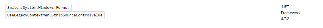 | |`Switch.System.Windows.Forms.`<br/>`UseLegacyContextMenuStripSourceControlValue`||.NET Framework 4.7.2|Determines whether the <xref:System.Windows.Forms.ContextMenuStrip.SourceControl?displayProperty=nameWithType> property returns the source control when the user opens the menu from a nested <xref:System.Windows.Forms.ToolStripMenuItem> control. `true` to return `null`, the legacy behavior; `false` to return the source control.|.NET Framework 4.7.2| |