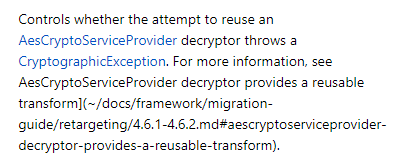 | |`Switch.System.ServiceModel.`<br/>`UseSha1InMsmqEncryptionAlgorithm`|Determines whether the default message signing algorithm for MSMQ messages in WCF is SHA1 or SHA256.|.NET Framework 4.7.1| | ||