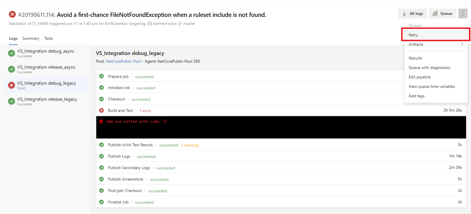 @KirillOsenkov You can manually do a Retry by following the failure links: I have kicked it off for you here. |