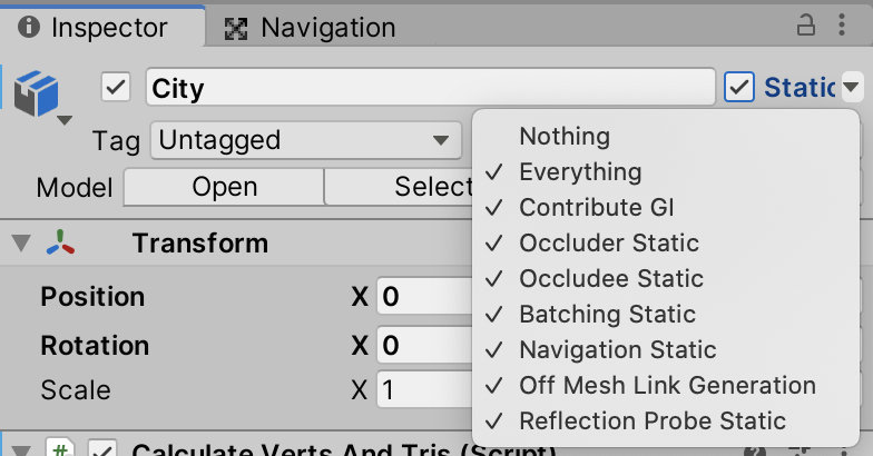 设置遮挡静态 Occluder Static / Occludee Static,并且将子物体同样设置为遮挡静态