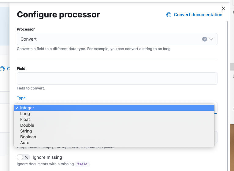 In elastic/elasticsearch#69989, a new type called ip was added to the convert processor. The Ingest Node Pipelines UI needs to be updated to support this option.