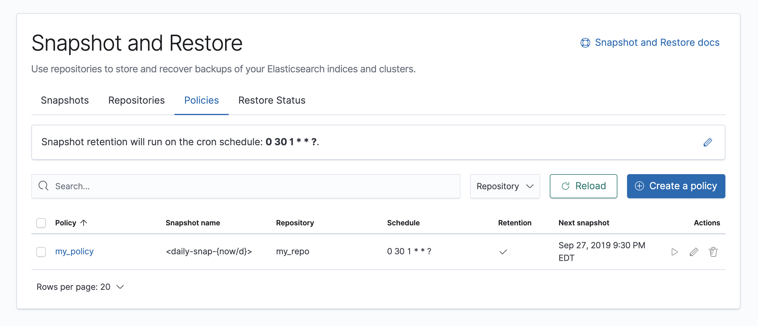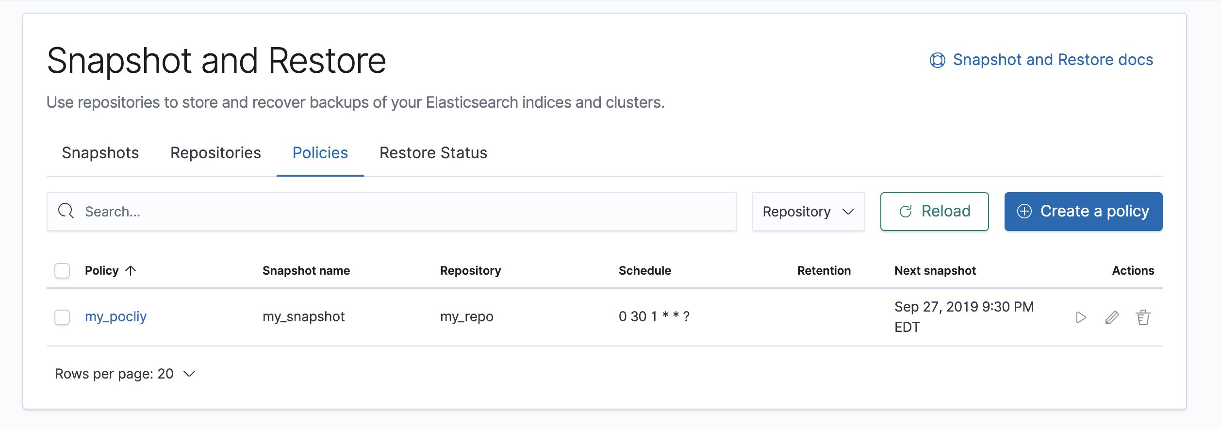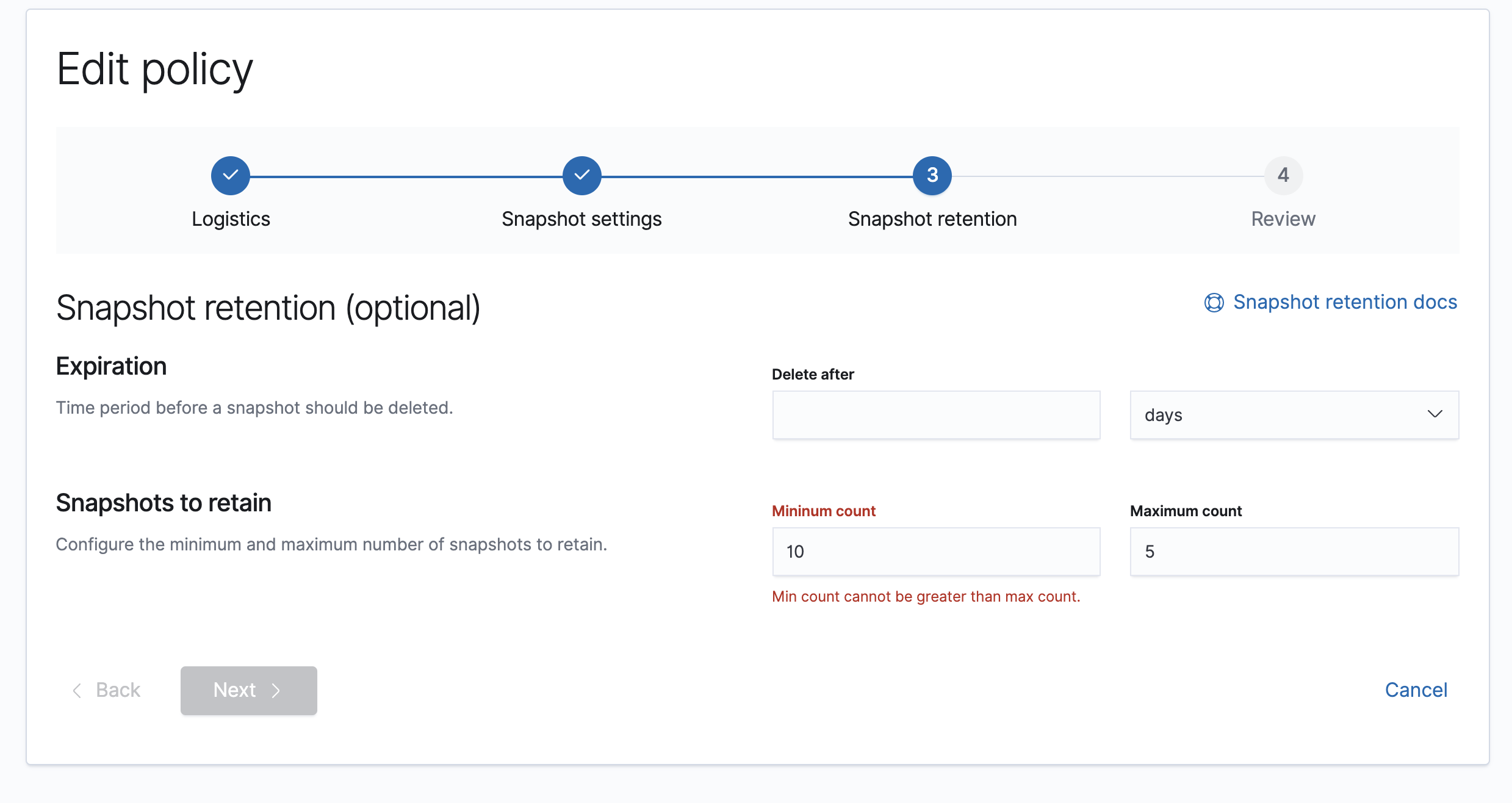 @alisonelizabeth Is this the right place to add this comment or you want me to create new defect? Snapshot retention policy defined from Kibana UI is not working as expected. Snapshots are not getting purged though retention policy expired. Tested for 1 hour and 1 day. |